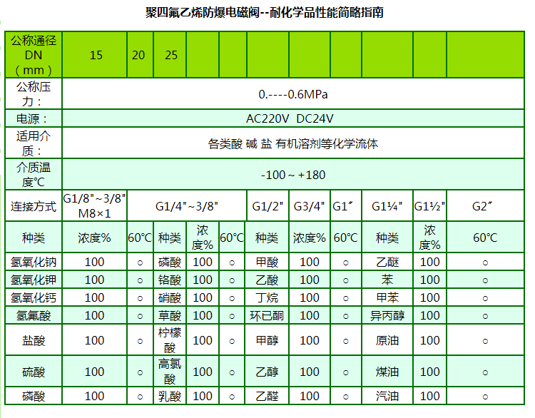 聚四氟乙烯化工電磁閥具有優(yōu)異的耐腐蝕性能,對(duì)所有的常用化學(xué)品都呈惰性。幾乎可以抵抗所有化學(xué)介質(zhì)(包括濃硫酸和王水)。具有優(yōu)異的耐熱性能,應(yīng)用溫度為-100~180℃,材料可長(zhǎng)期在230~260℃下工作。特別適合腐蝕嚴(yán)重、溫度高且化學(xué)品不允許與潤(rùn)滑劑接觸的環(huán)境。及易燃易爆環(huán)境使用。