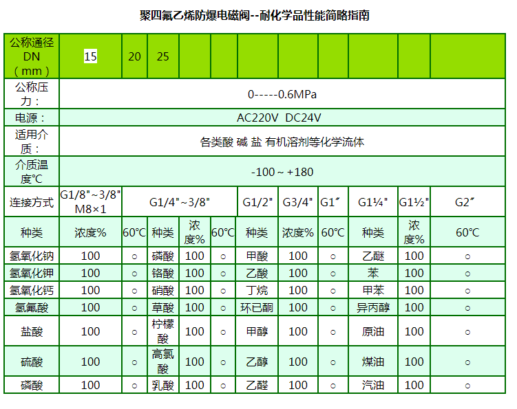 聚四氟乙烯化工電磁閥具有優(yōu)異的耐腐蝕性能,對所有的常用化學(xué)品都呈惰性。幾乎可以抵抗所有化學(xué)介質(zhì)(包括濃硫酸和王水)。具有優(yōu)異的耐熱性能,應(yīng)用溫度為-100~180℃,材料可長期在230~260℃下工作。特別適合腐蝕嚴(yán)重、溫度高且化學(xué)品不允許與潤滑劑接觸的環(huán)境,及易燃易爆環(huán)境使用.