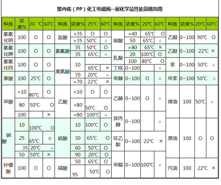 聚丙烯(PP)化工電磁閥具有優(yōu)良的耐腐蝕性能,在80℃下能耐除氧化性外的一般無(wú)機(jī)酸、堿、鹽、氣體、水等的腐蝕。它對(duì)極性有機(jī)溶劑和強(qiáng)極性的羧酸、醇類有較大的抗溶劑能力。少數(shù)氧化性酸在濃度較高時(shí)對(duì)其有較大的腐蝕作用。有一定的剛度和強(qiáng)度,適用溫度為-0~120℃。