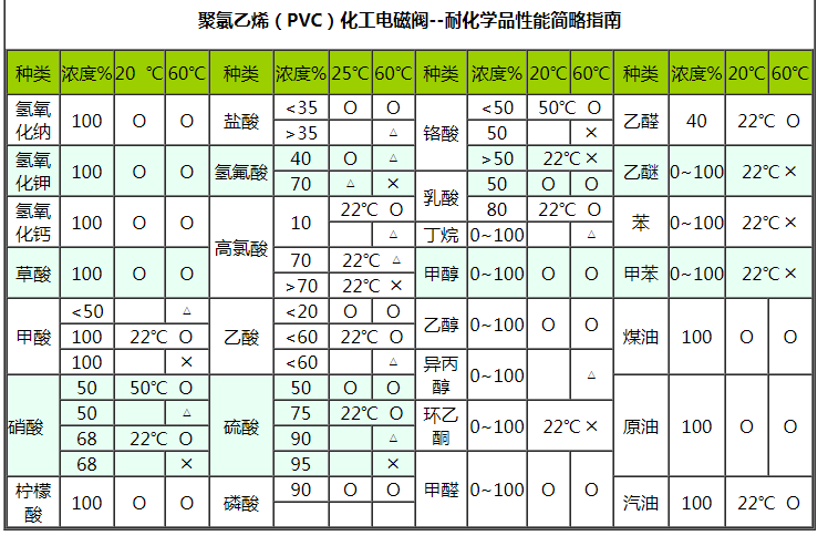 聚氯乙烯(PVC)化工電磁閥具有優(yōu)良的耐腐蝕性能,耐酸(包括稀硝酸)、堿、鹽、氣體、水等的腐蝕。對(duì)無(wú)極性的烷烴及強(qiáng)極性的羧酸、醇類(lèi)有較大的抗溶劑能力。少數(shù)氧化性酸在濃度較高時(shí)對(duì)其有較大的腐蝕作用。有一定的剛度和強(qiáng)度,適用溫度為-0~60℃。