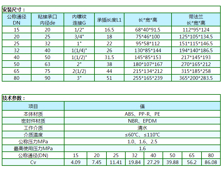 本產品民用系列選用國際通用型食品級工程塑料(ABS、PP-R、PE等)注造。工業(yè)用系列選用進口阻燃型高強度工程塑料(PC等)注造。產品具有重量輕、耐腐蝕、不生銹、不結垢、導冷不結霜、導熱系數低,絕緣性能好,環(huán)保衛(wèi)生等優(yōu)點。啟閉原理上:采用浮動閥芯,利用流體壓力差,誘導式啟閉的專利技術成果。因啟閉時無磨損(屬接觸型啟閉),而解決了傳統(tǒng)閥門因強制性啟閉而造成的啟閉部件和密封件磨損所引起的“跑、冒、滴、漏”的歷史性難題。它具有安裝使用方便,節(jié)能節(jié)水效果顯著(可節(jié)約傳統(tǒng)閥門的外泄內漏所浪費掉的水),使用壽命長及物美價廉等特點。